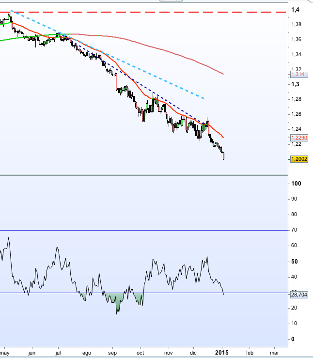 Si ya estás dentro (en cortos del EURUSD por ejemplo) no creo que sea el momento de salir. Estás en un subyacente en la dirección correcta de la tendencia pero sí debes estar alerta a un posible giro y por tanto no dejes tu stoploss muy lejos del precio.