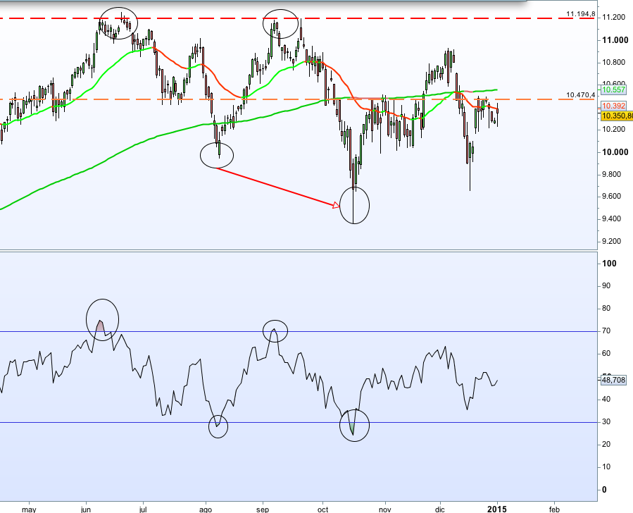 Para ello existen indicadores que nos deben ayudar a esta misión, entre ellos, el RSI (Relative Strenght Index) nos permite identificar si el precio está en sobrecompra o sobreventa oscilando entre 0 y 100 (a partir de 30 se condiera que el precio está en sobreventa, a partir de 70 el precio estaría en sobrecompra). Vemos aquí un ejemplo en el EURUSD: