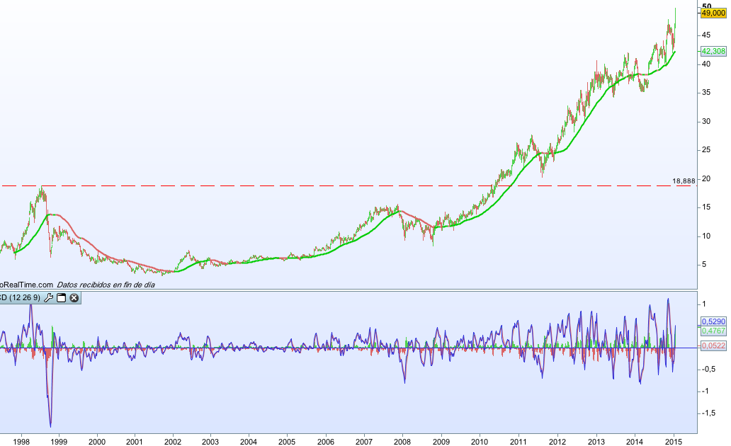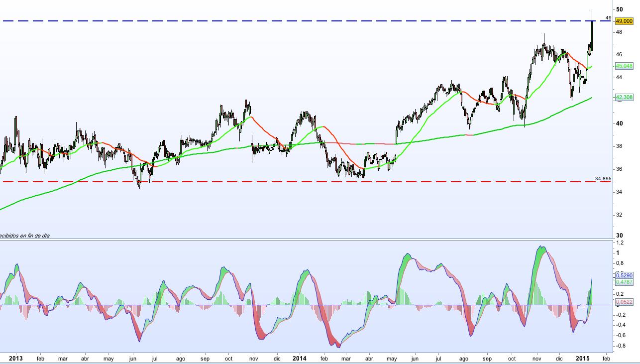 Actualmente se encuentra en máximos históricos después de romper la barrera de los 48 y por tanto vuelve a presentar un nuevo motivo para seguir pensando en ella como acción alcista para 2015.