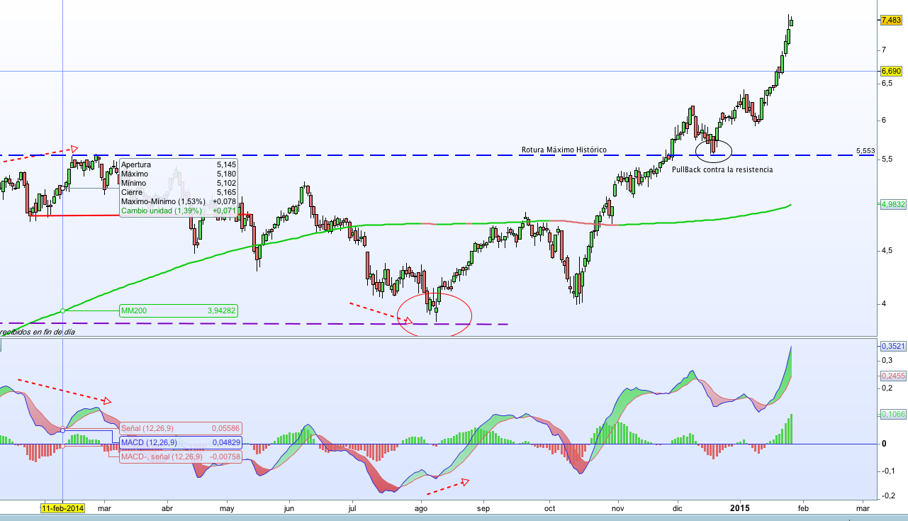 Para los que entraron en la rotura observada en noviembre podemos ver una revalorización del +33% en apenas un mes y medio, una gran evolución en el arranque de 2015.