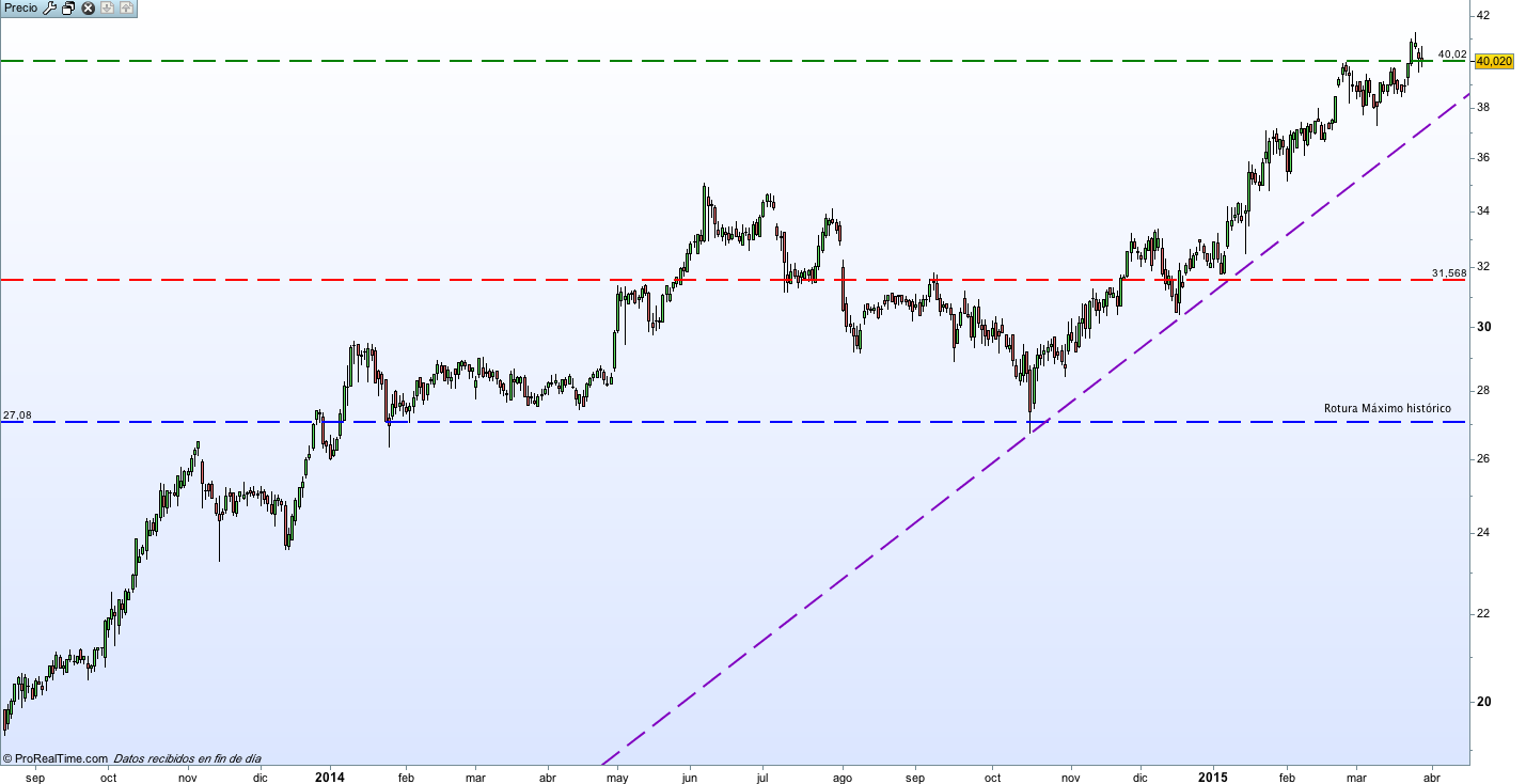 La recomendación sería de comprar ya que es un valor alcista y más fuerte que la media del mercado. Desde su rotura de máximos ha hecho una evolución del 46% y lo más probable es que durante este año 2015 continúe su tendencia alcista. Como toda operación de compra tenemos que buscar StopLoss que nos indiquen cuándo el precio está haciendo una corrección profunda que indique cambio en la tendencia.