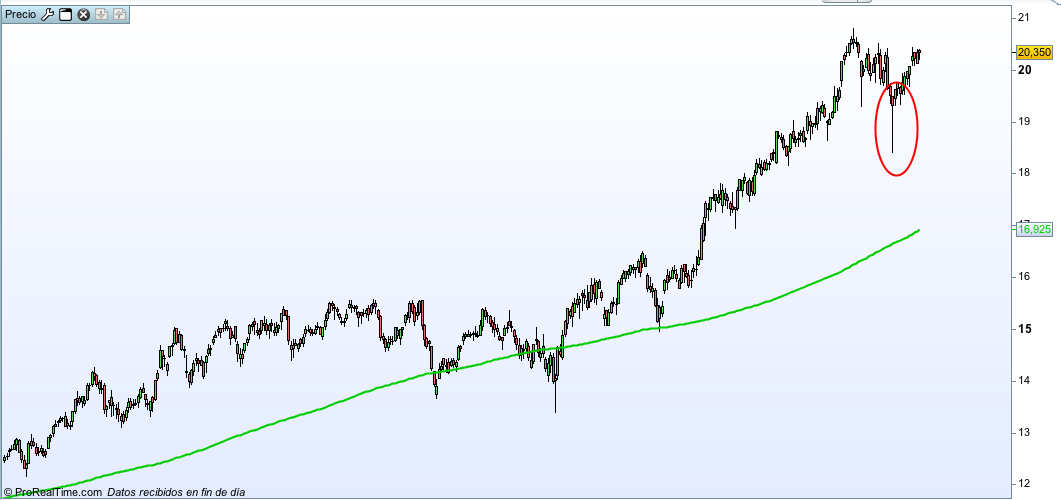 Por ello, cuando estamos en una empresa fuerte (que crece y está en máximos) podemos experimentar algunas sacudidas en el precio que hagan bajarse del caballo a algunos participantes para que después el precio siga libre hacia arriba.