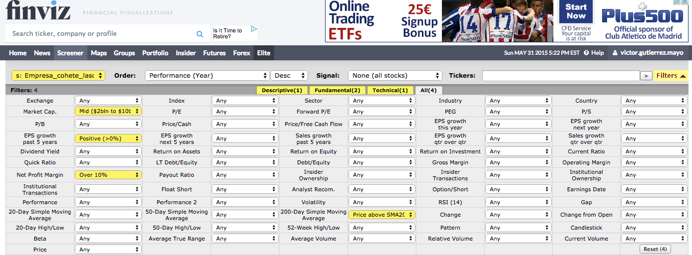 Y con esta segunda parte añadimos el segundo propulsor a nuestro cohete, el del crecimiento rápido. Estos son los parámetros que os propongo revisar en Finviz.com (con esto no significa que vayamos a encontrar a todos los cohetes que existen pero sí que muchos de ellos que salen en este screener lo son).