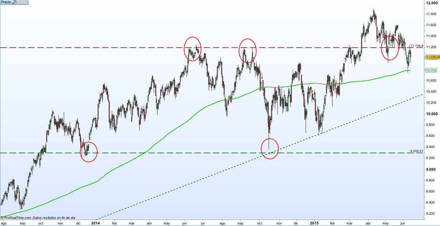Si hacemos un análisis de muy corto plazo veremos una situación de "quiero y no puedo". El índice había roto en marzo de 2015 de forma fuerte la resistencia de 11.200 puntos que lo mantenía retenido. A pesar de esa rotura clara la fuga de esa resistencia no se ha confirmado y sin apenas llegar a los 12.000 puntos hemos visto un nuevo retroceso que no parece haber tenido mucho soporte en la anterior resistencia rota.