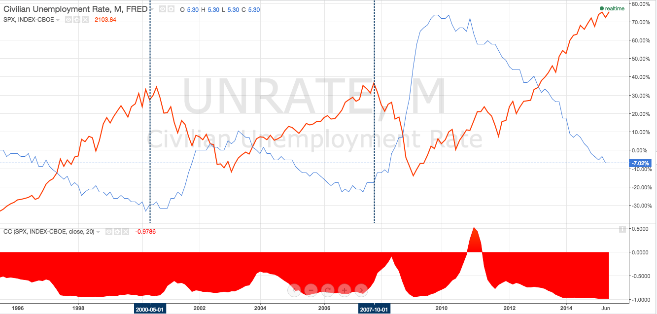 Para hacer algo de zoom en lo que ha pasado deberíamos hablar del desempleo en USA (el dato de paro). Cuando el paro ha subido el SP500 ha bajado y cuando el paro ha bajado el SP500 ha subido, vemos aquí el gráfico desde 1994 hasta hoy y la correlación inversa que tienen.