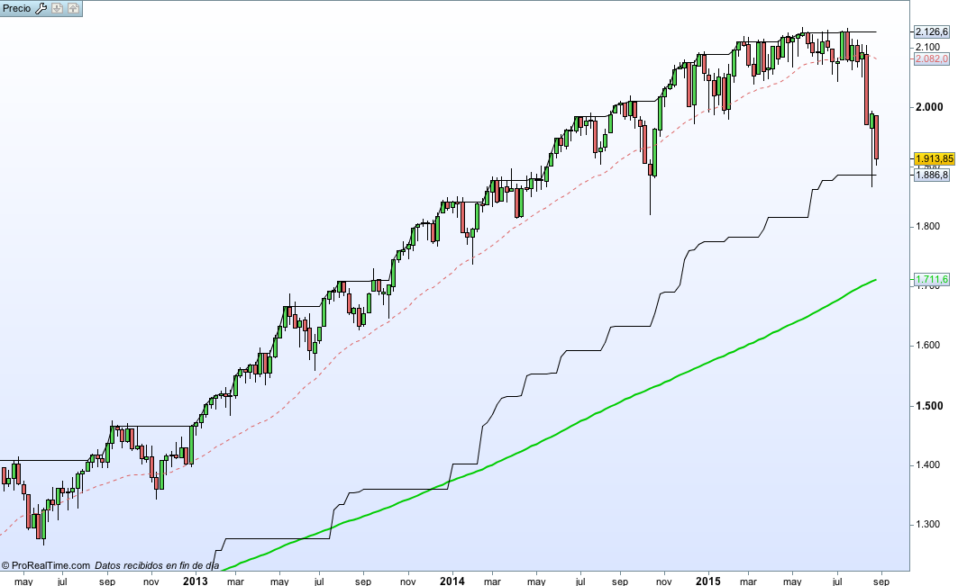Por un lado rescatamos de nuevo el gráfico semanal. Después de la rotura de los mínimos relativos más importantes y de romper la media móvil de 30 vemos que de momento no hay rebote que pueda anunciar una recuperación de los niveles perdidos (por el momento como mínimo) y los niveles del SP500 están marcando nuevos mínimos anuales (lo vemos en la línea negra inferior).