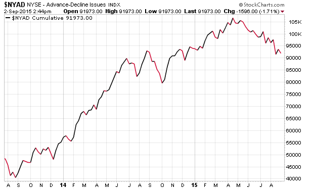 Otro punto importante a destacar es la evolución del dinero resumido en bolsa y para ello podemos leer el indicador de acumulación/distribución (hemos tomado la bolsa NYSE como referencia). En él vemos que desde ya Abril-Mayo de 2015 hay una salida de capital que ha ido marcando por un lado la falta de evolución alcista del mercado (resumida en la resistencia de los 2.100pts) y ahora en la tendencia bajista que parece estar arrancando.