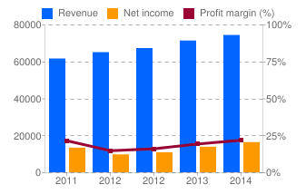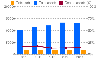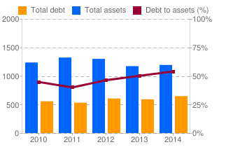 Como vemos, en sus ventas tuvo un momento de crecimiento fuerte en 2011, desde entonces ha habido estancamiento y bajada. En sus activos, cada vez hay menos fuerza y su deuda sube, incrementando también su ratio de deuda/activos.