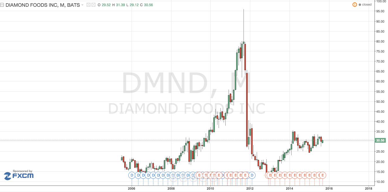 Ahora nos vamos al lado de los débiles, de aquellos que sus ventas no son tan buenas y además están en sectores débiles. Uno de los que me saltan a la palestra es Diamond Foods (DMND), la evolución de sus ventas y sus activos es la siguiente: