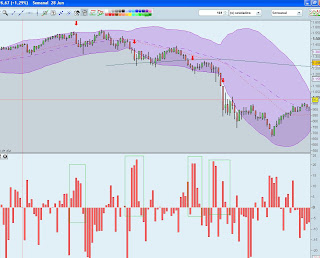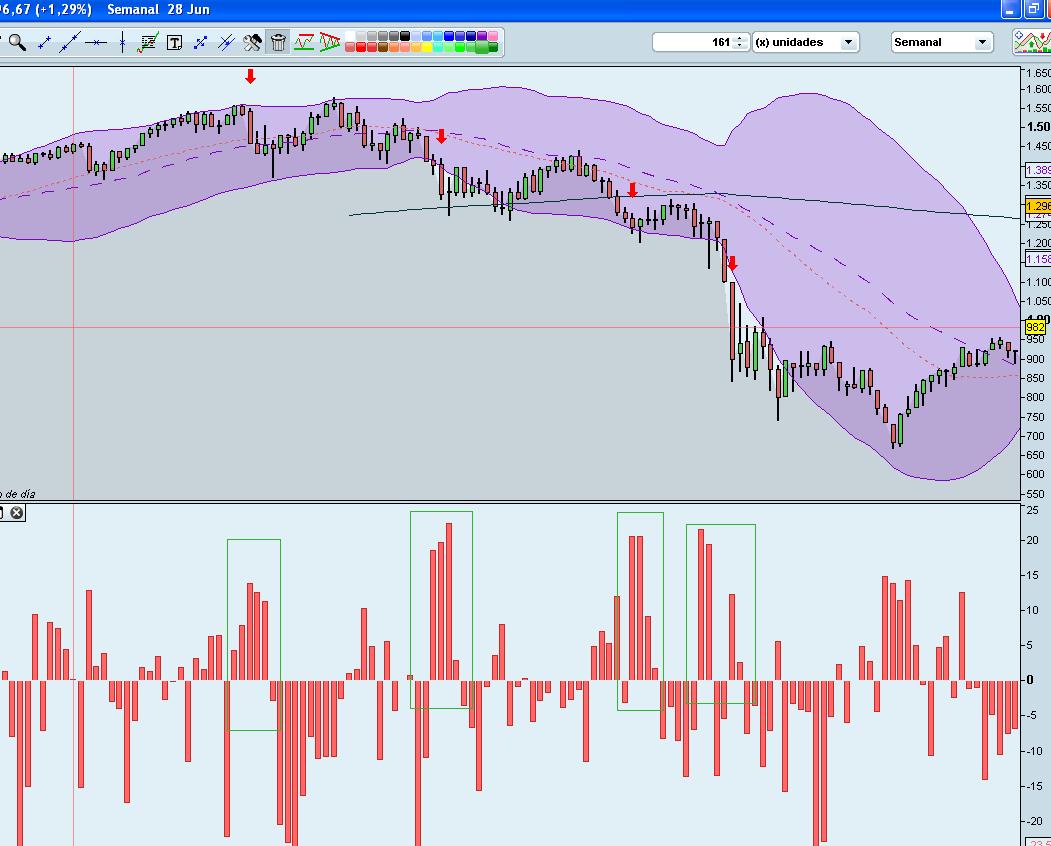 Hoy hablaremos sobre el volumen de las ventas, las cuales son tan potentes como el volumen de las compras. En este caso, se ha expuesto un ejemplo del SP500 semanal en un periodo anterior cuando todas las bolsas caian, se puede observar, que si hubiesemos observador el poder volumen ventas a pocos nos hubiese pillado todo el tramo bajista de los años de 2007 y 2008. En este caso, los grandes volumenes nos muestran la creación de enormes resistencias, siempre con un margen de error relativo, y con la consecuente tendencia bajista que, a continuación marca el mercado.