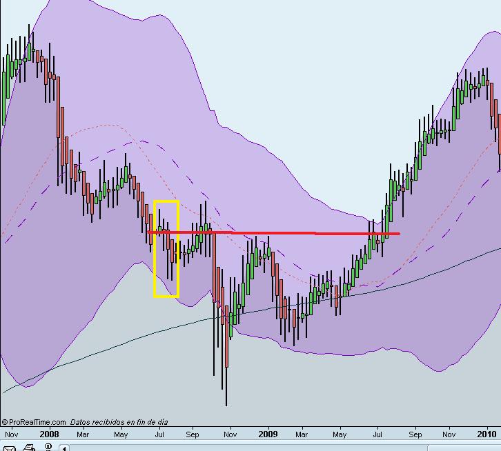 En torno a Julio, del año 2008, se publicaron resultados trimestrales de telefonica, los cuales, fueron realmente malos con respecto a las previsiones, el mercado, se lo tomó a mal, como es de lógica, sin embargo, se puede observar como con el paso del tiempo, por Julio del 2009 volvio a recuperar los valores de antes de los resultados, por lo tanto, volvió a subir.