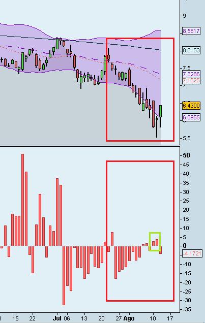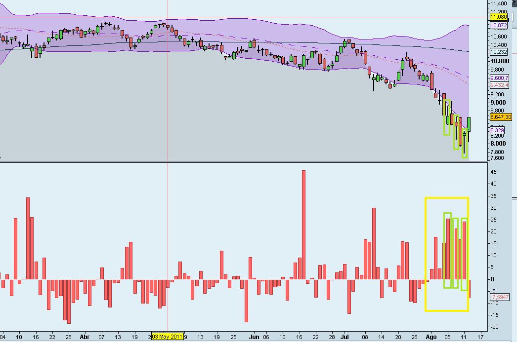 Y otra evidencia más, los principales bancos, como por ejemplo el BBVA, ha caido con un VPM bastante bajo, seguramente presionado por los bajistas, y donde se ha visto aumentado algo es por la zona de los 5,50.