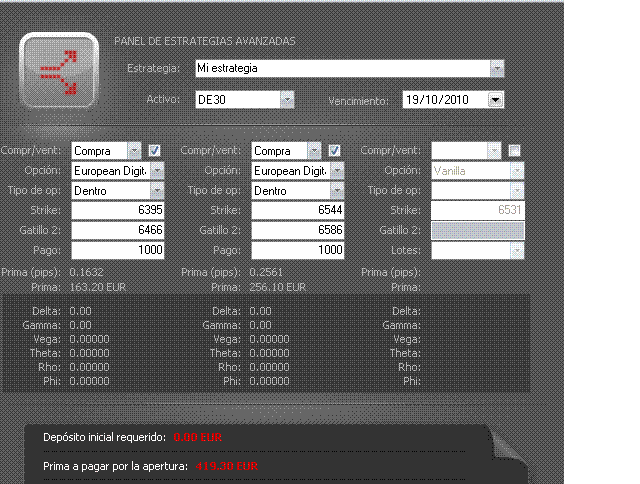 - Compra de una opción “European digital range” sobre el DE30, con vencimiento 19 Octubre de 2010, dentro de un rango limitado entre 6395 y 6466, escogiendo la cantidad a recibir “pago” 1000€. Por esta opción se pagará una prima de 163 euros.