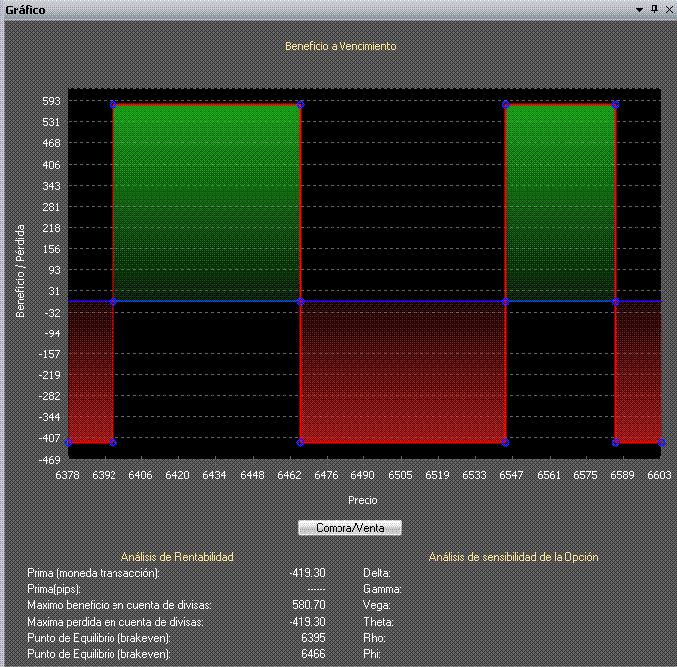 Vamos a plantear una estrategia de movimiento, es decir, tanto si el Dax se mueve a la baja y cotiza entre 6395 y 6466 el próximo día 19 de octubre, como si sube, situándose entre 6544 y 6586, en la misma fecha recibiremos 1.000€. El coste total de esta estrategia será de 419€ y para plantearla se deberá realizar la siguiente operativa con nuestra plataforma OPTION TRADER: