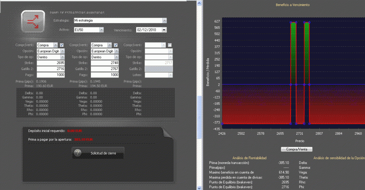 -Compra de una opción “European digital range” sobre el EU50, con vencimiento 2 Diciembre de 2010, entre 2695 y 2716, escogiendo la cantidad a recibir “pago” 1000€. Por esta opción se pagará una prima de 187 euros.