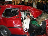 El motorista viajaba aproximadamente a 135 kmph. La conductora del VW estaba HABLANDO CON EL MOVIL cuando salió de una calle lateral, aparentemente sin ver la motocicleta. No tuvo tiempo de evitar el accidente. El auto llevaba dos pasajeros y el motorista fue encontrado dentro con ellos. El VW volcó por la fuerza del impacto y aterrizó a unos siete metros de donde ocurrió la colisión. Las tres personas murieron instantaneamente. Los vehículos se exibieron en una feria de motocicletas por la policía. Envíale esto a tus amistades recordándole no hablar por el móvil cuando conducen. Una foto vale más que mil palabras. "