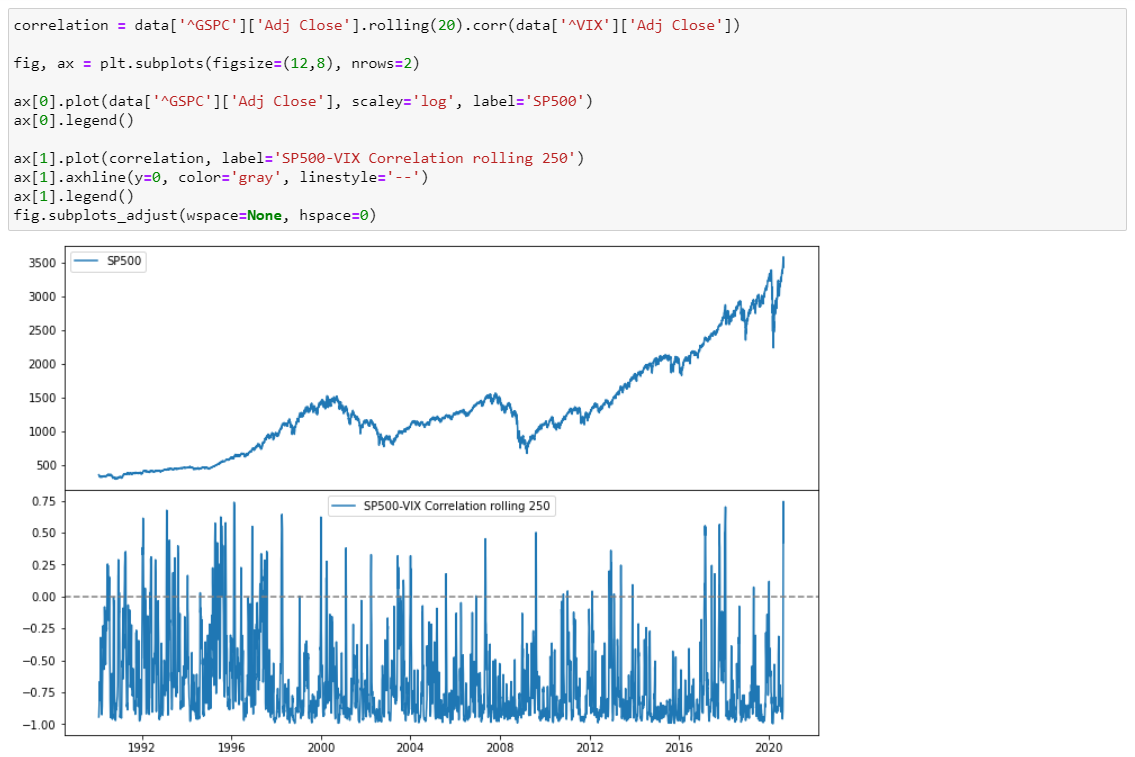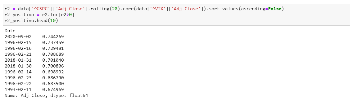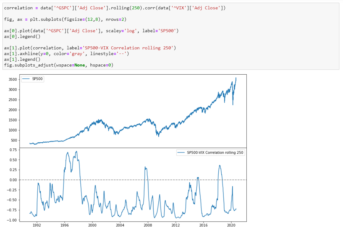 ¿Qué es esto?, bueno, simple, vamos haciendo una especie de media movil, pero no de los precios sino de la correlación entre ambas variaciones (SP500 y VIX) tomamos 250 jornadas que son aproximadamente las que hay en un año.