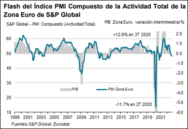 Uso de indicadores adelantados (NO retrasados, como pueden ser IPC, empleo…) como los PMI (índice de gestores de compra) de servicios y manufacturas que se publican dos veces al mes de los distintos países, se trata de encuestas que se hacen mensualmente a distintos gestores de un determinado sector para analizar sus previsiones de inventarios, órdenes, empleo u otras variables para el próximo mes. Datos por debajo de 50 nos indica contracción y posible recesión a futuro, debajo último dato de PMI compuesto de la Unión Europea.