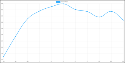 Inversión de curva de deuda: como está pasando actualmente en EEUU y pasó en las anteriores crisis de 2000 y 2008. Financieramente hablando, no tiene sentido que se pague más a un bonista que posee un título de deuda a más corto plazo que a otro que posea un título a un horizonte temporal más amplio, siendo el riesgo de crédito el mismo y tratándose del mismo emisor. Normalmente una curva invertida anticipa periodos de recesión, a 6-18 meses vista. Debajo curva actual de EEUU. A partir del tramo 2-3 años a más largo plazo, se encuentra actualmente la curva invertida.