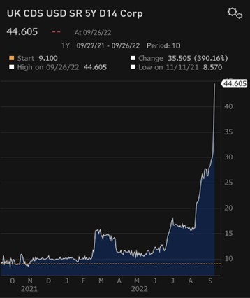 CDS (Credit Default Swap) derivado que sirve para cubrir el riesgo de crédito en caso de impago de un determinado emisor, mide mejor las posibilidades de impago por parte de un emisor, no tanto el dato de “Prima de riesgo” que sigue el mercado, que es la “simple” diferencia de rentabilidades entre dos países a 10 años. Cuanto mayor sea el CDS, mayor es el riesgo de impago de un determinado emisor, posible recesión si dicho riesgo se transmite al resto del mercado. Un ejemplo muy cercano lo hemos visto en Reino Unido con una súbita subida durante los últimos días por ese recorte fiscal propuesto por el nuevo Gobierno la pasada semana. Debajo CDS de UK a 5 años durante los últimos días: