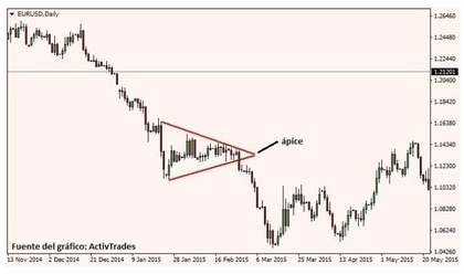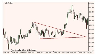 Sobre el gráfico diario del USD/JPY, cortesía del broker de Forex y CFDs ActivTrades, podemos observar cómo el precio se consolida y forma un triángulo. Lo importante es que después de la consolidación, el precio rompe por encima del triángulo o la línea de tendencia bajista y acelera su impulso al alza. Otro punto que hay que tener en cuenta con los triángulos, es que hay un 50% de probabilidades de que el precio retroceda después de la ruptura del triángulo antes de continuar en dirección de la ruptura inicial.