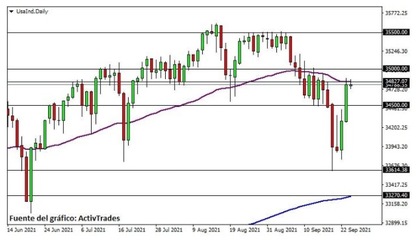 Esa misma media móvil estuvo actuando como resistencia durante la semana pasada y ahora es posible que el Dow Jones regrese a la baja si llegan a aumentar de nuevo los temores con el caso Evergrande.