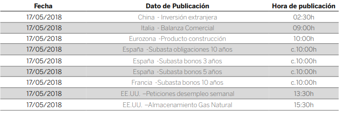 A nivel macro, el IPC de la eurozona se mantuvo en el 1,2%, lejos del 2% marcado como objetivo por parte del BCE. El IPC subyacente se mantiene en el 0,7%. En EE.UU. el crecimiento de la producción industrial del mes de abril se mantuvo estable en 0,7%.