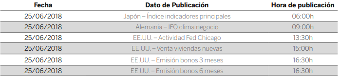 En cuanto a los datos macroeconómicos, el PMI manufacturero de la eurozona registró un descenso de 55,5 a 55 en el mes de junio mientras que el PMI de servicio se incrementó de 53,8 a 55. En EE.UU. el PMI de servicios del país desciende de 56,8 a 56,5 mientras el manufacturero cae de 56,4 a 54,6.