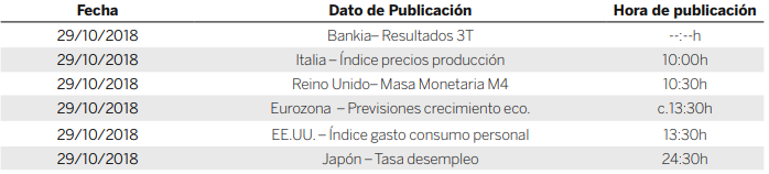 Los índices europeos están viviendo el peor mes de octubre desde 2015. El Eurostoxx-50 (-0,94%) registró nuevas caídas el pasado viernes lastrado por el sector de telecomunicaciones y financiero. Las presiones sobre el sector automovilístico derivadas de las medidas arancelarias adoptadas por EE.UU. y China, empiezan a hacerse palpables tras conocerse la segunda rebaja de previsiones realizada por Valeo (-21,02%) que arrastró al CAC-40 (-1,21%) hasta los 4.967 puntos.