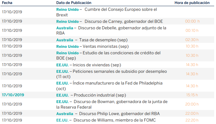 Jornada de recogida de beneficios en la sesión de ayer en los mercados norteamericanos y cierres mixtos en las bolsas del Viejo Continente. Las contradicciones en los mensajes que nos llegan del posible acuerdo del Brexit entre las partes implicadas añadieron puntos de incertidumbre adicional a los mercados. En EE.UU. pesó así mismo en la jornada de ayer un dato peor de lo esperado de ventas minoristas (Ver análisis del dato en BBVA Trader) y el estancamiento de las negociaciones comerciales con China.