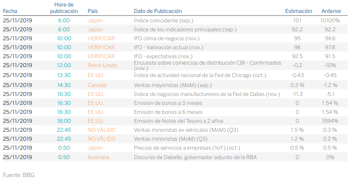 En los mercados de renta fija se dejaron notar los efectos de los datos macro conocidos en la sesión del viernes. Casi todas las curvas del Viejo Continente giraban a la baja mientras que el crédito corporativo se mantenía estable. Los datos de PMI conocidos en Europa se giraban nuevamente a la baja con el compuesto de la eurozona en niveles de 50.3 vs 50.6 anteriores y respecto a los 50.9 esperados por el consenso de analistas. El PMI compuesto se debilitó de nuevo en noviembre si bien mejoró el componente manufacturero pero el de servicios se mantuvo muy débil reflejando el contagio desde el manufacturero de los meses previos. En EE.UU. en PMI Markit noviembre mejoró las expectativas del consenso.