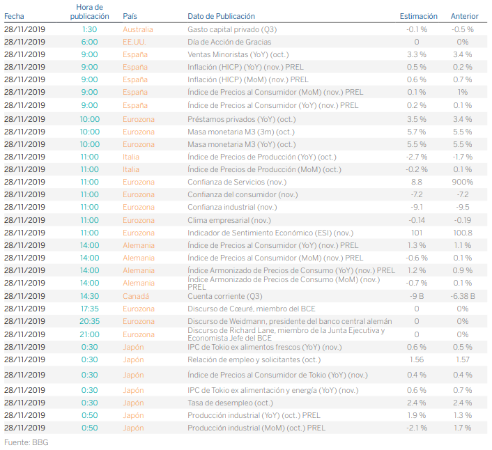 En EE.UU. el PIB del tercer trimestre sorprendió positivamente al alza hasta el 2,1% frente al 1,9% del trimestre anterior.Los buenos datos macroeconómicos también apoyaron las subidas de los principales índices destacando el comportamiento del Nasdaq-100 (+0,70%) que se apuntó las mayores revalorizaciones apoyado por el sector tecnológico. El S&P-500 (+0,42%) alcanzó nuevos máximos históricos. Wall Street permanecerá cerrado hoy por el día de Acción de Gracias y el viernes tan solo abrirá media sesión (hasta las 19:00 horas, horario España).