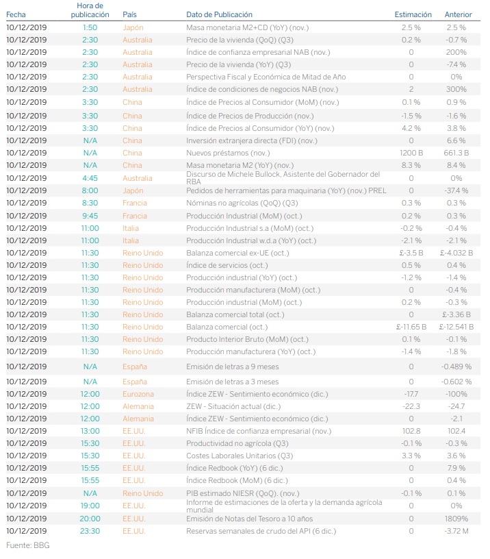 Ayer vivimos una sesión de transición a la espera de las grandes referencias macroeconómicas, de política económica y políticas que se esperan esta semana. Hoy comienza la reunión de política monetaria de la Reserva Federal en EE.UU. que terminará mañana miercoles en la que no se esperan cambios significativos pero si alguna novedad de cara a las previsiones del nuevo año que comienza. Estaremos también muy atentos a las elecciones del Reino Unido y a la reunión del próximo jueves del BCE, primera para la nueva presidenta Christine Lagarde al frente de la institución.