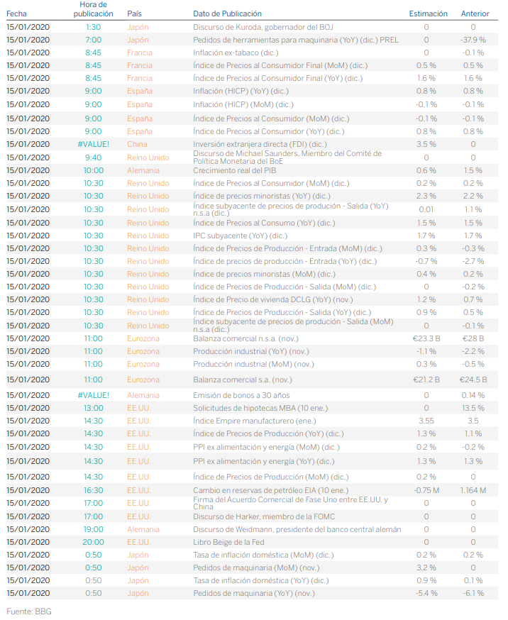 Hoy la atencion de los inversores estará centrada en los importantes datos macro que conoceremos tanto en Europa como en EE.UU. con la firma de la fase 1 del acuerdo comercial como principal evento de la sesión junto con la campaña de resultados empresariales en EE.UU.