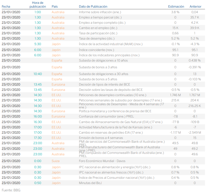 En el mercado de divisas, el par EUR/USD (+0,10%) se situó en 1,1093 a cierre del mercado americano, en una sesión muy vólatil tras las numerosas comparecencias de los líderes mundiales en Davos. En el mercado de materias primas, el Brent (-2,53%) cotizó en 63,07 dólares por barril por el pronóstico de excedente de crudo y los efectos negativos en la industria turística por el Coronavirus.