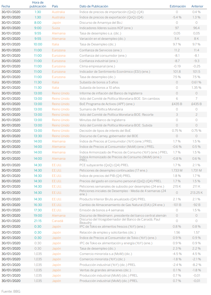 Wall Street por su parte cerró en los mínimos de la sesión tras confirmar nuevos casos de expansión del coronavirus de Wuhan. El S&P-500 (-0,09%) cerró con mínimas caídas por el mal comportamiento del sector energético. El Nasdaq-100 (+0,12%) consiguió repuntar apoyado en las subidas de Facebook (+2,5%), Tesla (+2,5%) y Apple (+2,1%).