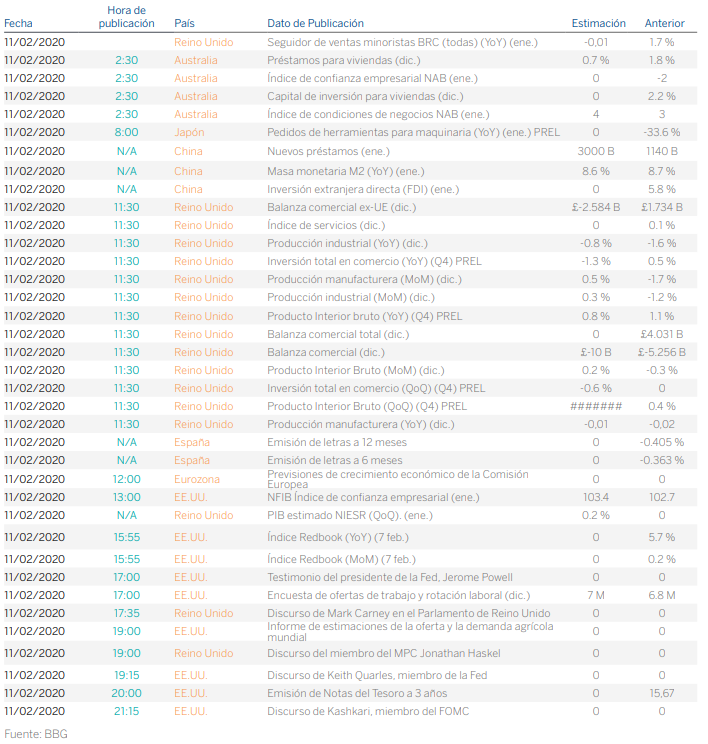 A pesar de la incertidmbre del coronavirus y que la actual epidemia supera el número de fallecidos de epidemias anteriores como el SARS, los inversores se aferraron a la bajada en la tasa de contagios para llevar a los principales índices de Wall Street a marcar nuevos máximos históricos. Las principales bolsas europeas cerraron con leves pérdidas por la recogida de beneficios tras el rally de la pasada semana, a excepción de las bolsas periféricas que cerraron en positivo destacando el comportamiento del FTSE Mib (+0,12%). El Ibex-35 (+0,05%) cerró plano en 9.816 puntos, consiguiendo situarse en máximos de julio de 2018.