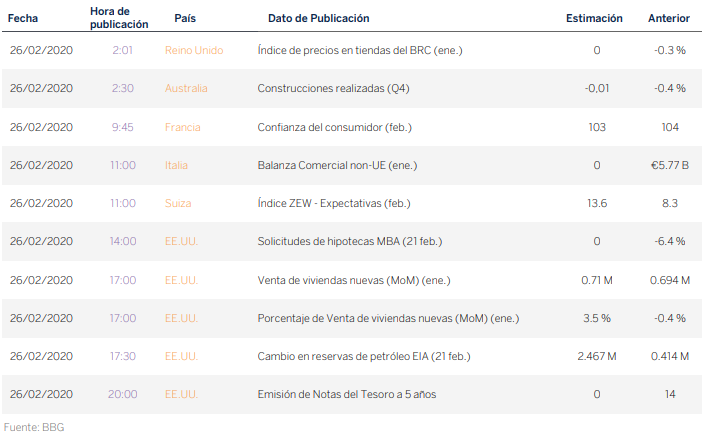 En el mercado de divisas, el euro mantuvo cierta apreciación frente al dólar y cotizó en 1,0879 a cierre del mercado americano, acusando las menores expectativas de la economía norteamericana tanto por el mundo de indicadores adelantados conocidos ayer como por la advertencia de las autoridades sanitarias estadounidenses sobre la propagación del coronavirus por todo el país.