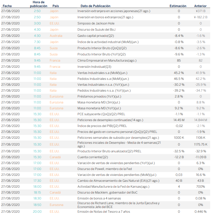 Hoy la atención de los inversores estará puesta en el inicio del Simposio de Jackson Hole, reunión de banqueros centrales en la que se podrían detallar las conclusiones de la revisión estratégica de la política monetaria de la Fed así como anunciar nuevas medidas de estímulo monetario.