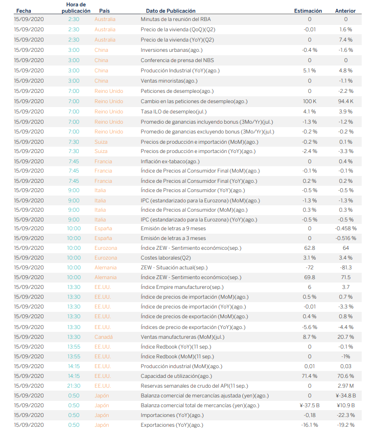 La sesión de hoy cuenta con algunas referencias macroeconómicas interesantes como la tasa de desempleo de agosto en Reino Unido, el IPC final de agosto en Francia, el IPC armonizado de agosto en Italia y los costes laborales del segundo trimestre en la eurozona además de la encuesta ZEW de sentimiento inversor en Alemania. En EE.UU. se publica la encuesta manufacturera de Nueva York de septiembre, el índice de precios de importación de agosto y la producción industrial de agosto.