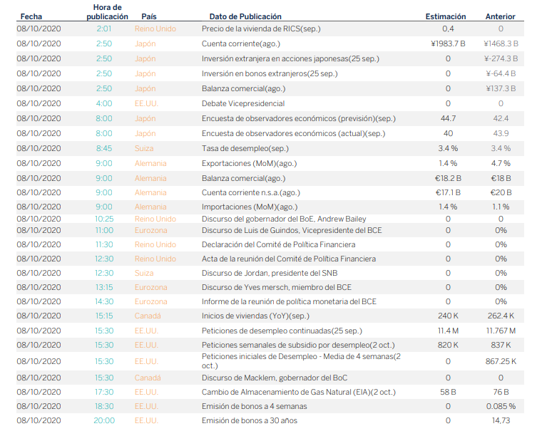 Los principales índices de Wall Street cerraron la sesión con alzas entorno al 2% impulsados por el paquete de rescate a las aerolíneas en EE.UU., que acercaba posiciones entre republicanos y demócratas y, la victoria en los sondeos de Joe Biden en las próximas elecciones presidenciales. La renta variable europea cerró la jornada sin apenas cambios y peor desempeño relativo del Ibex 35 (-0,38%) y del CAC 40 (-0,27%).