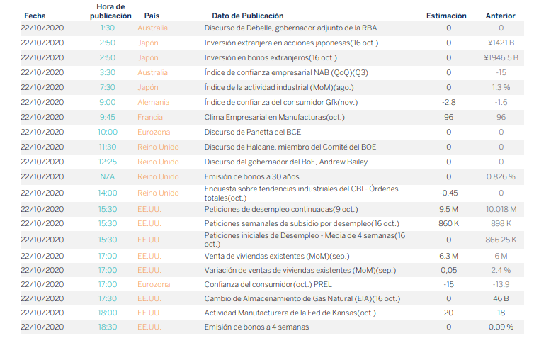 En Europa, las bolsas terminaron la jornada con pérdidas muy importantes ante el empeoramiento de la situación sanitaria y el miedo a nuevos confinamientos mucho mas restrictivos y extensivos. Vimos un peor comportamiento de los países periféricos con el FTSE Mib (-2,03%) a la cabeza de las pérdidas seguido del Ibex 35 (-1,67%).