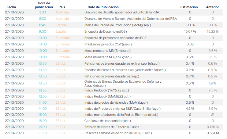 La aversión al riesgo volvió a adueñarse de los mercados de renta variable a ambos lados del Atlántico. En EE.UU., al pesimismo derivado del crecimiento de casos Covid-19 en la segunda ola y su impacto en el crecimiento económico del cuarto trimestre, se unieron la falta de acuerdo fiscal en EE.UU. y la proximidad de las elecciones en el país, que hicieron que las bolsas de Wall Street acumularan importantes pérdidas.