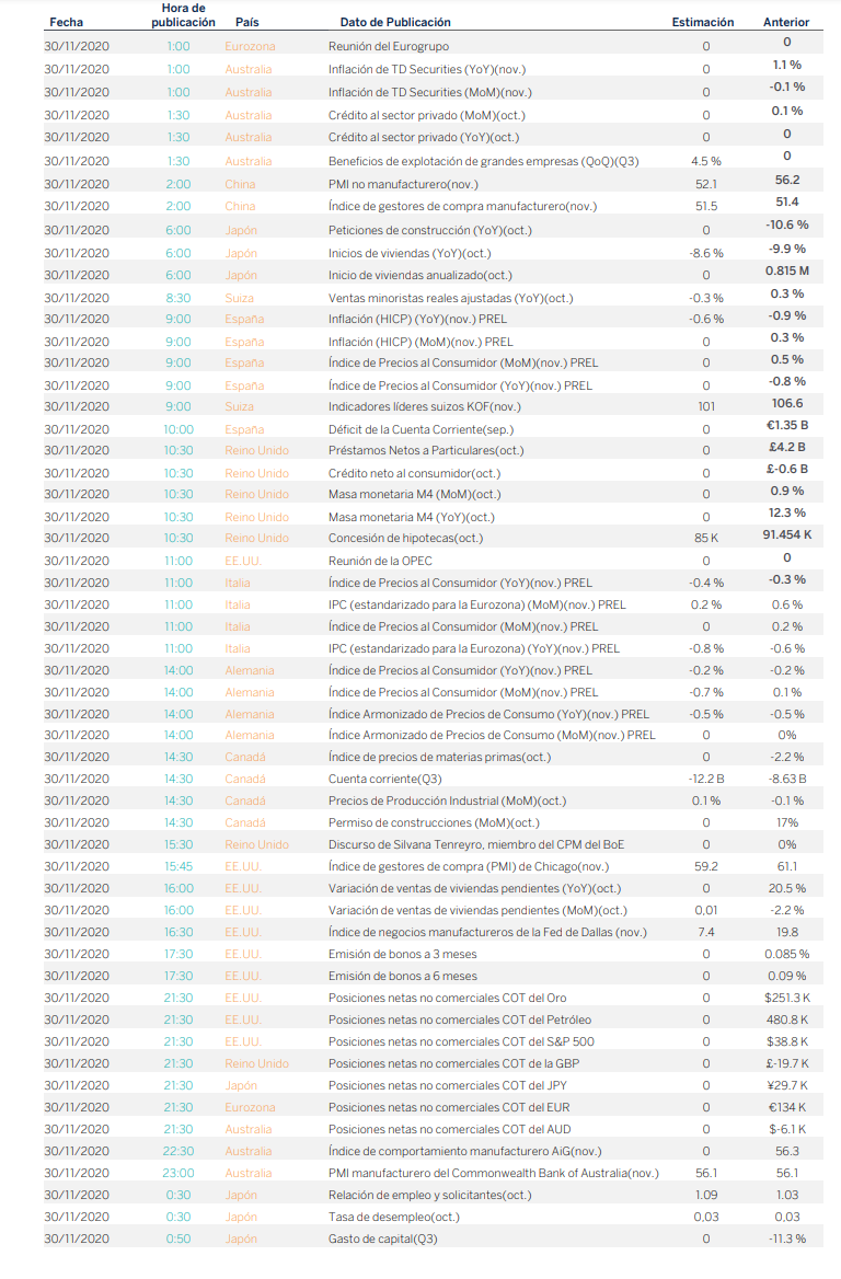 Tras la euforia inicial derivada del anuncio de las vacunas, los temores sobre el desarrollo de la pandemia a corto plazo vuelven al mercado, sobre todo en EE.UU. Además esta semana se reinician las conversación entre UK y la UE, y cuentan con cinco semanas para alcanzar un posible acuerdo sobre el Brexit.