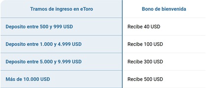 ⭐ Promo destacada: Actualmente, eToro suele lanzar bonos de bienvenida o promociones específicas, entre los cuales podrás conseguir hasta 500 USD gratis, solo por abrir cuenta y hacer un primer depósito. Justo abajo, te dejo la cantidad de bonos de bienvenida asociada a cada tramo de ingreso.