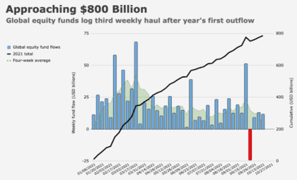 En el año 2000 ese porcentaje llegó al 51%. Mientras que algunas firmas de inversión siguen apostando por un alza de esta cifra, por aquello de no existir alternativa mejor para asignar el capital en estos tiempos, la realidad es que el análisis de los flujos sigue siendo positivo. En concreto son casi 800.000 millones de USD lo que ha entrado en renta variable global en 2021, pese a que hay que mencionar la desaceleración (con alguna semana incluso negativa) de esta llegada de dinero a bolsa. Según datos de Goldman, los activos en cash que tienen los hogares suman 14 billones de USD, con un aumento desde la pandemia de 2,3 billones.