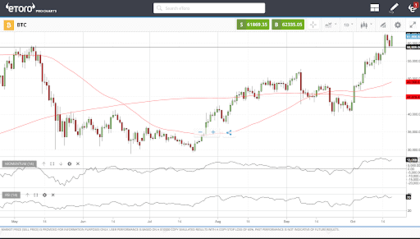 Euforia en el mercado cripto Desde un punto de vista técnico, alcanzados y superados los 60K USD, lo lógico es asistir a una etapa de alta volatilidad mientras estemos dentro del rango 58.000-64.000USD. Vamos a considerar estos niveles como los que marcarán cambios futuros de alta relevancia. Si bien el sentimiento de mercado ha entrado en zona de euforia, se acumulan alzas del 40% en octubre y las noticias del ETF sobre futuros de BTC dominan el panorama, entrar en subida libre al superar los 64K puede generar un nuevo impulso que atraerá a inversores de corto plazo.
