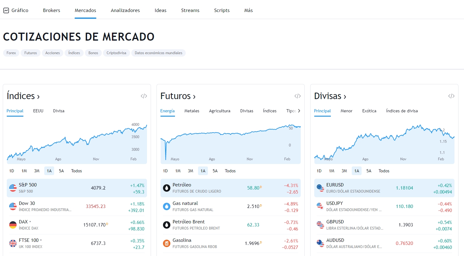Es posible visualizar un resumen de los principales mercados. Al presionar sobre la pestaña “Mercados” se muestran cuadros con las cotizaciones de los principales instrumentos financieros y un pequeño gráfico. Útil para ponerse al día de cómo están evolucionando los diferentes instrumentos y ponerse al día al comenzar la jornada de trading.