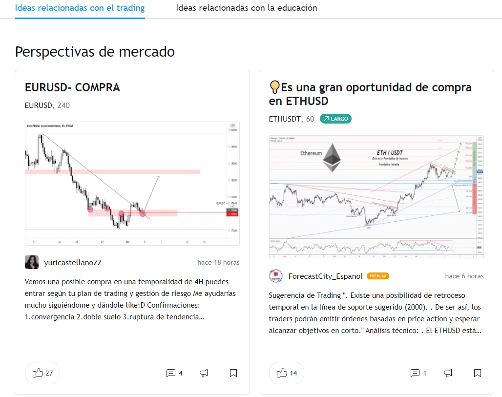 En la pestaña “Ideas” se accede a los diferentes análisis que otros usuarios han realizado. Esta función contiene un gran valor instructivo. El trader tiene a su disposición una fuente de estrategias y razonamientos de análisis.
