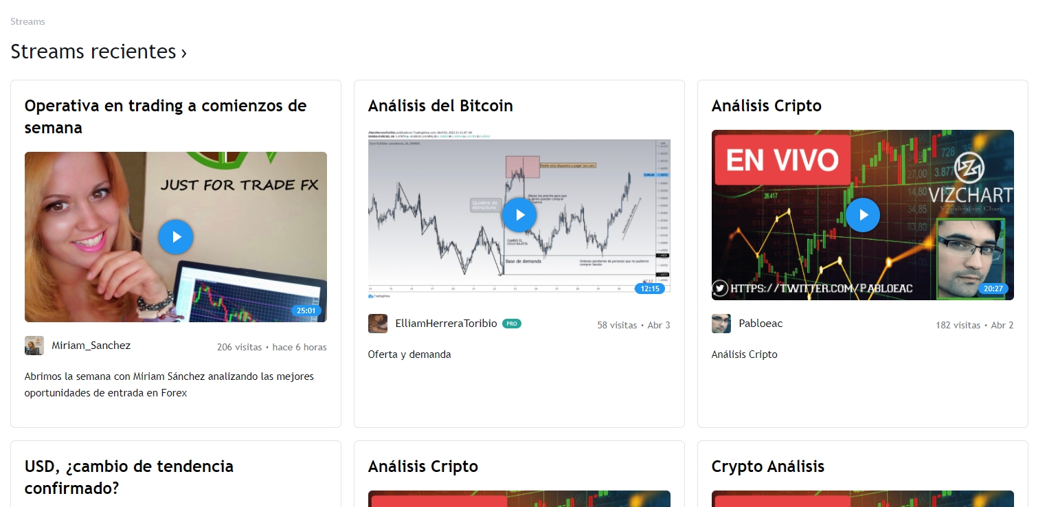 TradingView también ofrece transmisiones en directo para traders e inversores. De la misma forma que cualquier usuario de la plataforma tiene la oportunidad de convertirse en streamer.